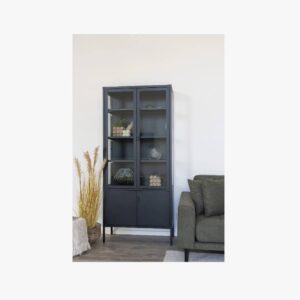 Featuring a sleek black steel frame and elegant glass doors, this tall cabinet offers a stylish and secure way to display your collectibles, books, or décor.