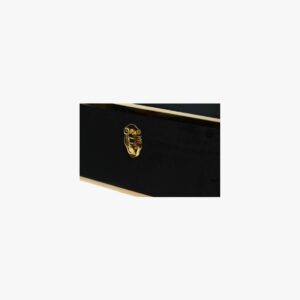- Features a rich black velvet complemented by striking gold-toned details