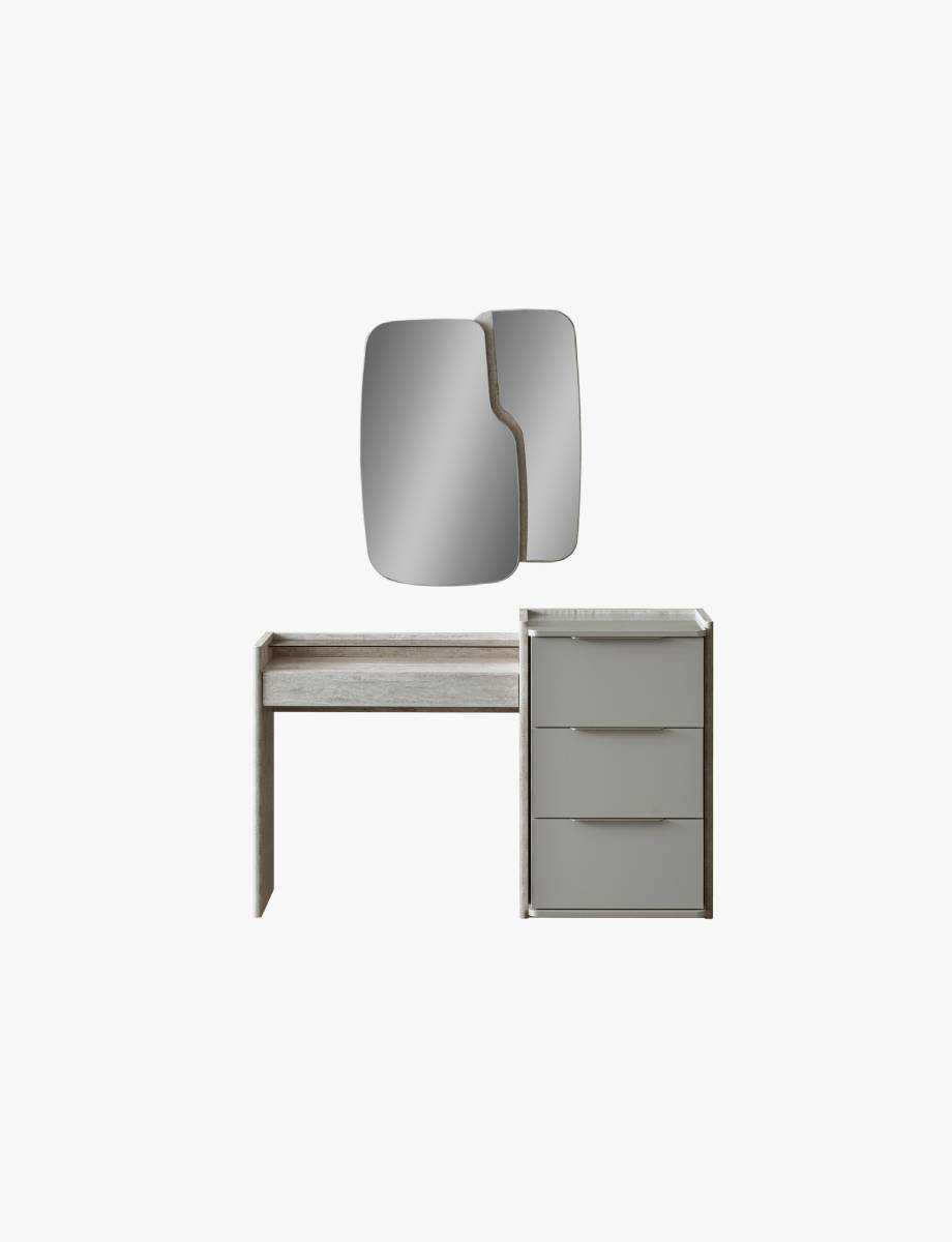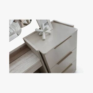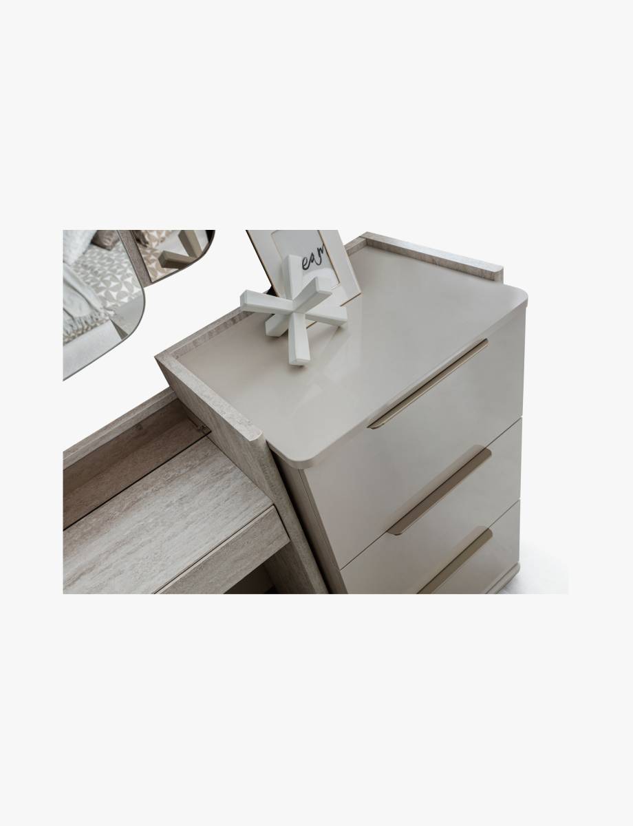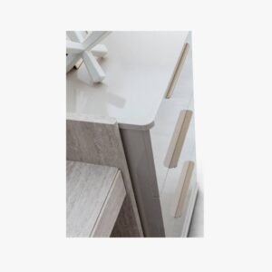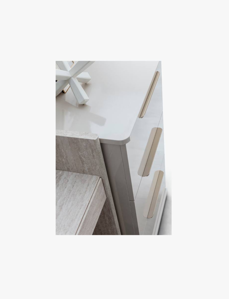 The Point Dresser combines a contemporary light color palette with delicate stone textures to bring an elegant and functional storage solution to the modern bedroom.
